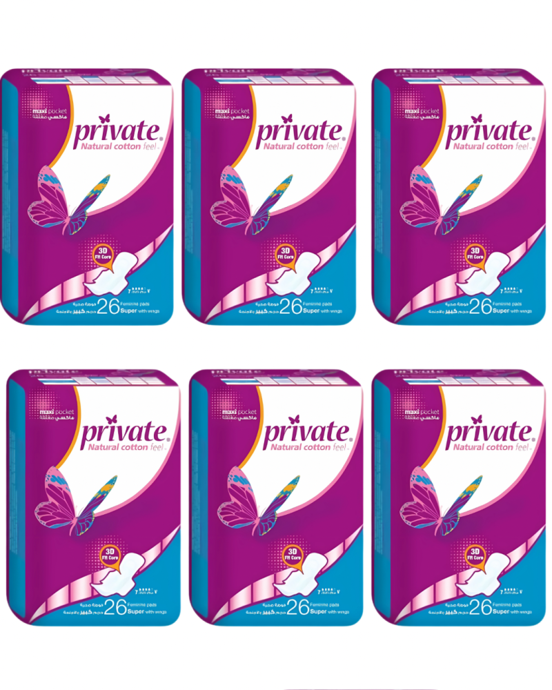 كرتون برايفت فوط صحية بالاجنحة ٦ عبوات بداخل كل عبوة 26 فوطة